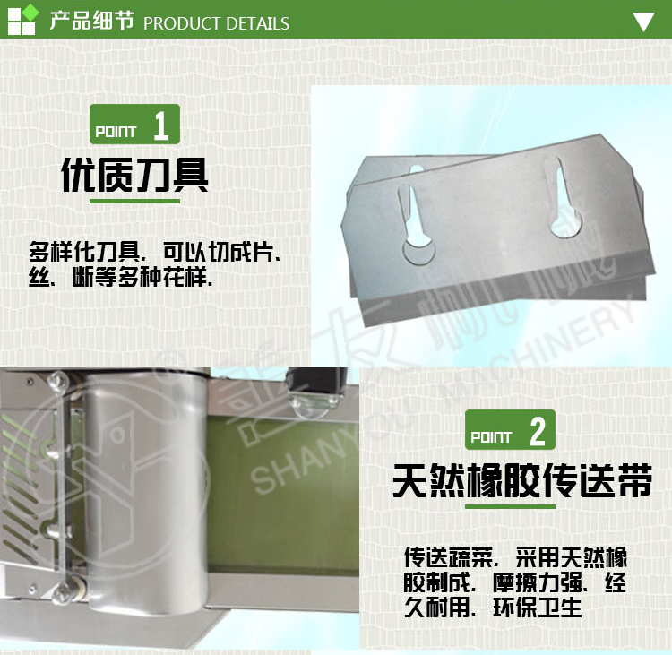 主要由机架,输送带,压菜带,切片机构,调速箱或塔轮调速机组成,用于瓜薯类硬菜的切片,片厚可在一定范围内自由调节,竖刀部分可将叶类软菜或切好的片加工成不同规格的块,丁,菱形等各种形状。切菜长度通过“可调偏心轮”在一定范围内任意调整。因竖刀模拟手工切菜原理,加工表面平整光滑,成型规则,被切蔬菜组织完好,保持新鲜。
