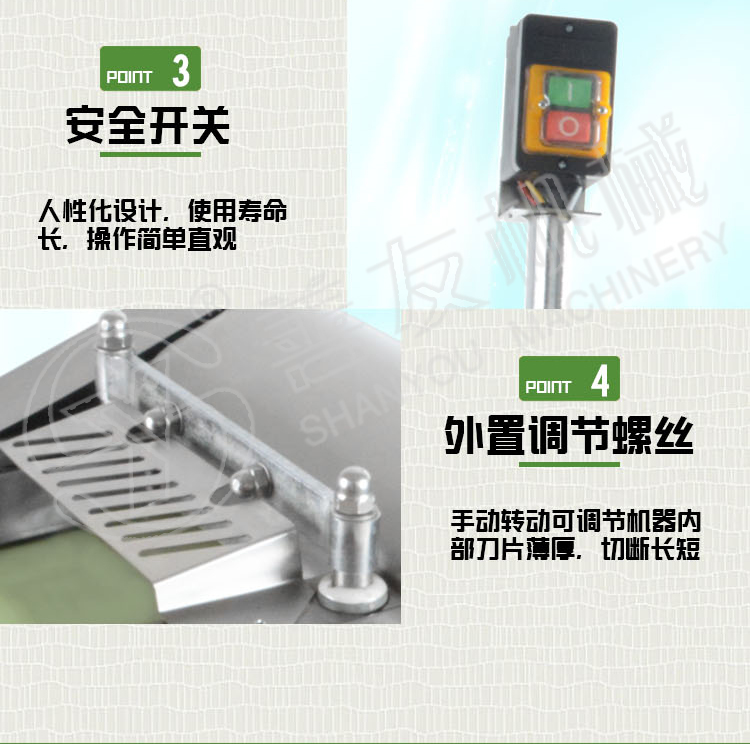 切菜机采用100%铜线电机,不锈钢机身,经久耐用,切丁切丝的厚度在1-10毫米内自由调整。采用竖刀以及用离心切片机头,先把物料切成片,再根据需要调节,然后切成所需规格的丝或曲线、块、丁、菱形等花样!